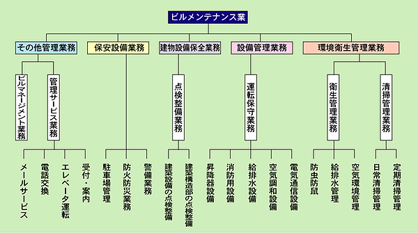 設備管理業務:ビル内にある設備機械の運転、監視、点検、設備保全、管理記録を主に行います。各種ビル設備を運転するためには、それぞれに法定の資格が必要になります。 |